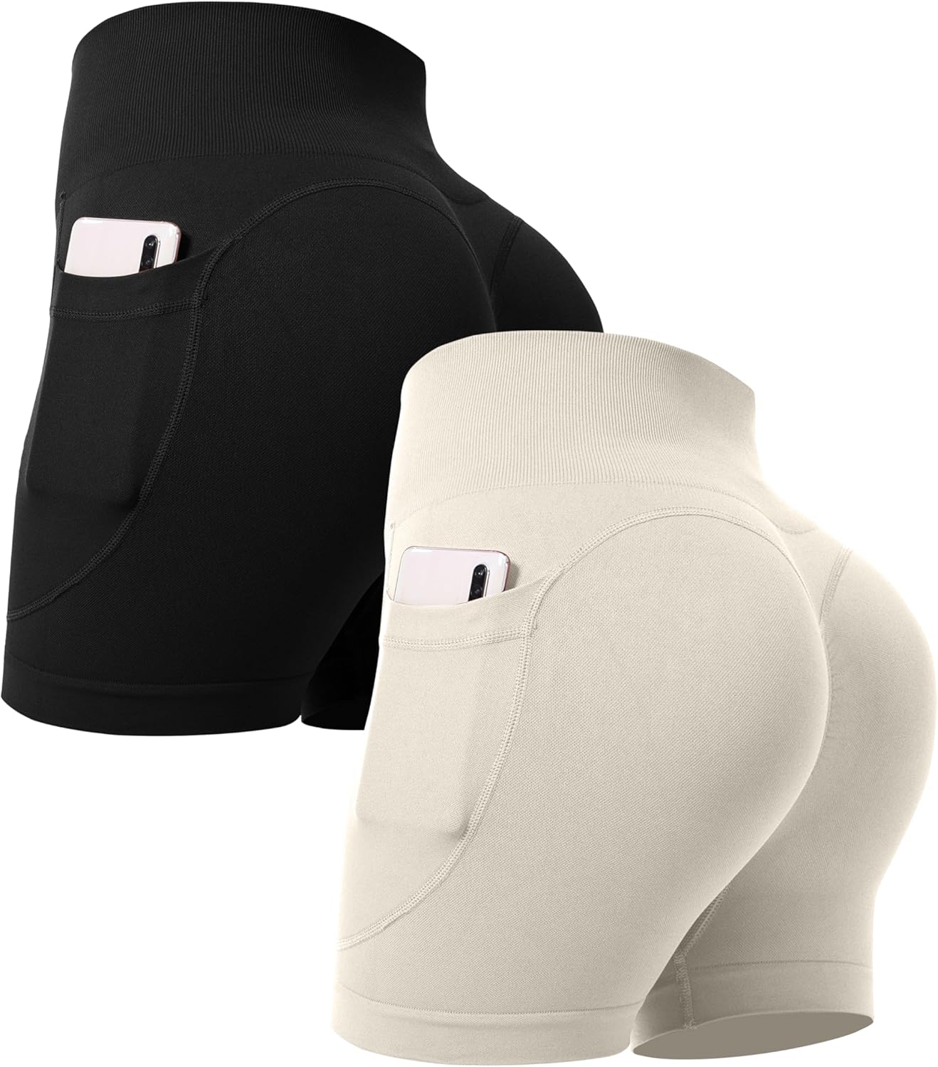 OVESPORT 2 Pack Scrunch Butt Lifting Workout Shorts for Women with Pockets High Waist Seamless Gym Yoga Shorts