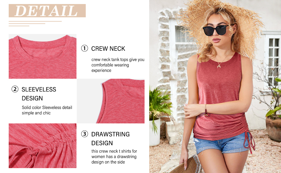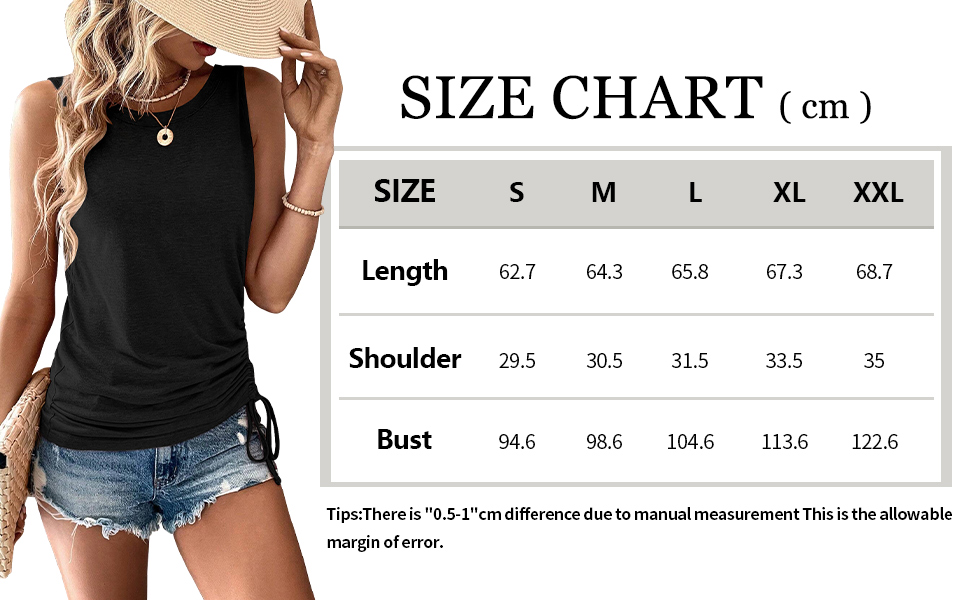 - u003Cliu003Eu003Cspan class=u0022a-list-item a-size-base a-color-baseu0022u003EMaterial: this tank tops made of a blend of 60% polyester, 5% synthetic silk, and 35% spandex, this womens tops offers the perfect combination of stretchability, breathability, and durability. The polyester fabric ensures a wrinkle-resistant and comfortable fit, with this womens tank top, you can stay cool and comfortable on hot summer days.u003C/spanu003Eu003C/liu003E u003Cliu003Eu003Cspan class=u0022a-list-item a-size-base a-color-baseu0022u003EDesign: This summer tops has drawstrings on the side, the drawstring can be used as a loose fit tank top when unraveled, or as a slim fit tank top when pulled tight to show off your perfect figure. this summer tops for women can easily switch between a loose and slimming style, offering versatility in your wardrobe.u003C/spanu003Eu003C/liu003E u003Cliu003Eu003Cspan class=u0022a-list-item a-size-base a-color-baseu0022u003EMatch: The cute tank tops is fashionable and versatile. It can be paired with necklace, shorts, overalls, jeans, jogging pants or skirts to create a trendy street style. This sleeveless tops for women is a must-have basic top for your closet.u003C/spanu003Eu003C/liu003E u003Cliu003Eu003Cspan class=u0022a-list-item a-size-base a-color-baseu0022u003EOccasion: Whether itu0027s for indoor, outdoor, casual, daily wear, lounge, school, work, beach, vacation, travel, dates, going out, club, party, shopping, this white tops for women is the perfect choice. ladies summer tops a versatile piece that can be dressed up or down for various occasions.u003C/spanu003Eu003C/liu003E u003Cliu003Eu003Cspan class=u0022a-list-item a-size-base a-color-baseu0022u003EMultiple sizes: this womenu0027s loose casual tops has five sizes: S/M/L/XL/XXL to meet the needs of women of different body types; provide a variety of sizes, update your look with our Womenu0027s Sleeveless Tank Top and experience the perfect blend of style, comfort, and versatility.u003C/spanu003Eu003C/liu003E